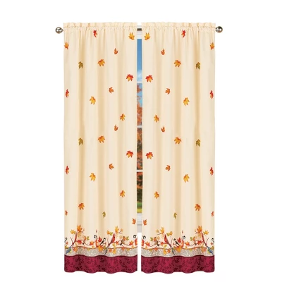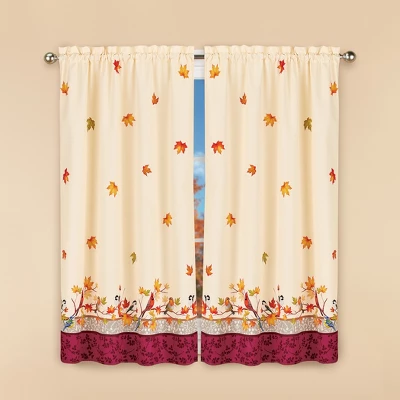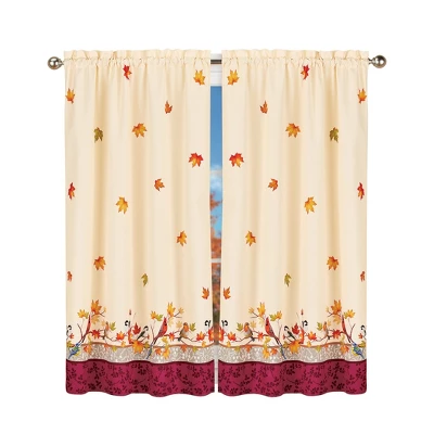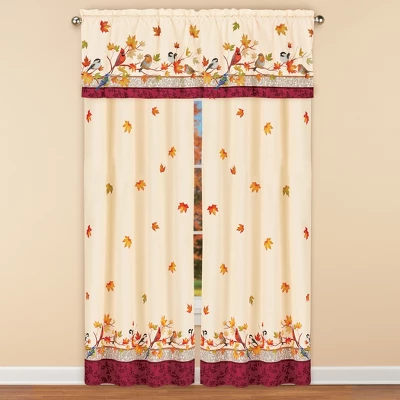 These beautifully printed curtains feature a festive design of cascading leaves atop an ivory background. Beautiful songbirds are perched on branches above the burgundy border. Rod pocket tops make hanging easy anywhere in your home. Panel pairs and valance sold separately. Machine wash. Polyester; imported. Choose: Valance (17″L x 54″W), 63″ Panel Pair (63″L x 45″W each) or 84″ Panel Pair (84″L x 45″W each).