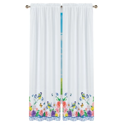 These lovely curtains are a great way to add seasonal color to any room in your home. Chickadees and butterflies visit a garden of bright flowers above a blue and white border. Rod pocket tops make hanging easy. Panel pairs and valance sold separately. Machine wash. Polyester; imported. Choose: Valance (17″L x 54″W), 63″ Panel Pair (63″L x 45″W each) or 84″ Panel Pair (84″L x 45″W each).