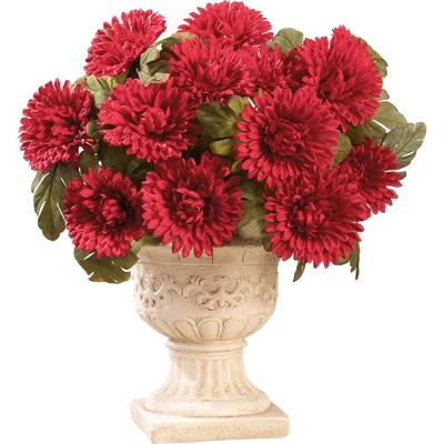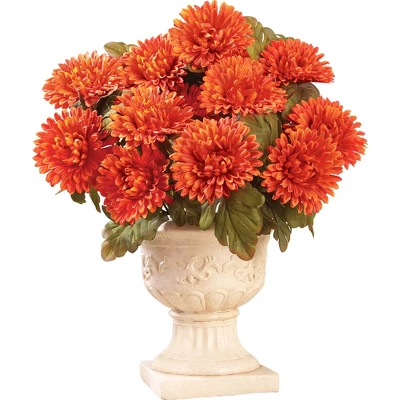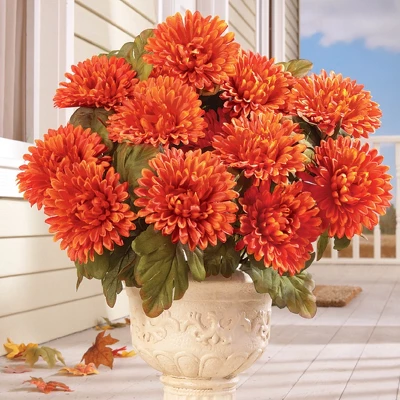 These beautiful mums are the perfect way to add instant color indoors or out. Set includes 3 full bunches of mums in rich red, warm orange or golden yellow. Use them together or separately, in your pots or baskets, or stake them into the ground in your garden. Pot not included. Use separately for smaller bouquets or all together for a bold and beautiful arrangement (as shown). Polyester. Each bunch has 7 large blooms and is approx 18″H. Available in Red, Orange or Yellow.