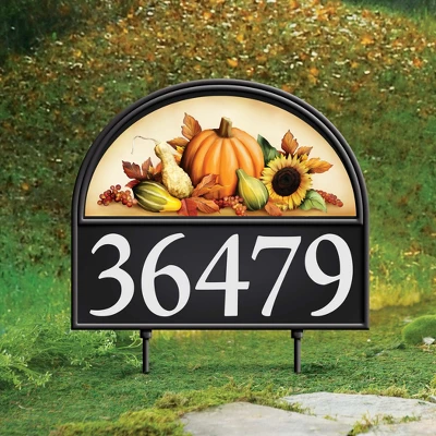 Clever address marker stakes into the ground and includes 4 seasonal magnets, and 5 sets of decals (numbered 0-9). Sign 11″L x 15 1/4″H.