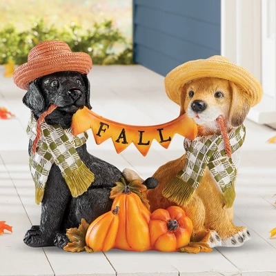 An adorable addition to your fall decorating, this unique sitter features two hand-painted dogs wearing green plaid scarves and straw-look hats. They hold a banner that reads “Fall” and are surrounded by bright orange pumpkins and autumn leaves. Perfect to display outside or indoors. Resin. 8 3/4″L x 4″W x 7 1/2″H.