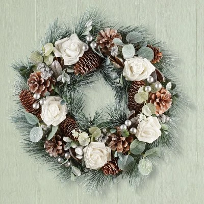 Bring nature’s winter beauty indoors for an impressive holiday display. Lush pine boughs are decorated with beautiful white roses, silver berries, leaves and pinecones. Perfect on a door, in the foyer or anywhere in your home for the season, it has hardware on the back for easy hanging. Polyester, plastic, pinecones. 15″Dia.