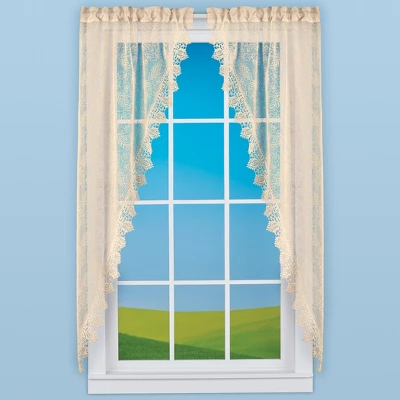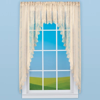 Dress your windows in style with these beautifully detailed, lace curtains. Available as a valance or swag set, they can be used individually or together as shown. They feature a lovely lace leaf design and rod pocket tops make hanging easy. Sold separately. Machine wash. Polyester; imported. Choose: White or Ivory. Available in: Valance (19″L x 60″W) or Swag Set (63″L x 30″W each).
