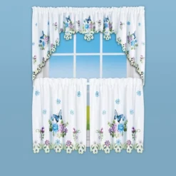 These charming, embroidered curtains feature a lovely yellow and pink lily border with beautiful blue, orange and pink butterflies flying above. The white curtains have a pretty, cutout border at the bottom edge of valance and lace trim on panels. Rod pocket tops. Machine wash. Polyester; imported. Choose: Valance (34″L x 58″W), 63″ Panel Pair Set of 2 (63″L x 42″W each) or 84″ Panel Pair Set of 2 (84″L x 42″W each).