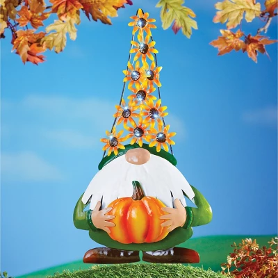 These charming gnomes are loaded with Autumn accents. Each wears a tall sunflower hat with sparkling solar-powered LED lights that automatically shine at night. Each stakes easily into the ground and includes 1 “AAA” rechargeable battery. Iron. 8 1/2″L x 15 1/4″H. Choose: Pumpkin or Sunflower.